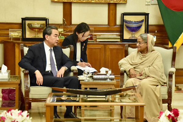 ທ່ານຫວາງຢີ້ໄດ້ຝາກຄວາມຢື້ຢາມຖາມຂ່າວຂອງທ່ານປະທານສີຈີ້ນຜີງ ແລະ ທ່ານນາຍົກລັດຖະມົນຕີຫຼີເຄີ້ສຽງຕໍ່ທ່ານນາງຮາຊິນາ ແລະ ກ່າວວ່າ ຈີນ ກັບ ບັງກະລາເດັດເປັນເພື່ອນມິດທີ່ດີ ແລະ ຄູ່ຮ່ວມທີ່ດີເຊິ່ງກັນແລະກັນ, ຈີນຍິນດີສືບຕໍ່ຮ່ວມກັບບັງກະລາເດັດສະໜັບສະໜູນເຊິ່ງກັນແລະກັນໃນບັນຫາທີ່ກ່ຽວພັນເຖິງຜົນປະໂຫຍດໃຈກາງຂອງແຕ່ລະຝ່າຍ ແລະບັນຫາສຳຄັນທີ່ສົນໃຈຮ່ວມກັນ, ລົງເລິກການພົວພັນຄູ່ຮ່ວມມືຍຸດທະສາດຈີນ-ບັງກະລາເດັດ. ຮ່ວມກັນເລັ່ງຂະບວນການສ້າງ "ໜຶ່ງແລວທາງໜຶ່ງເສັ້ນທາງ"ຮ່ວມ, ຕັ້ງໜ້າຊຸກຍູ້ການສ້າງ"ແລວທາງເສດຖະກິດບັງກະລາເດັດ-ຈີນ-ອິນເດຍ-ມຽນມາ".