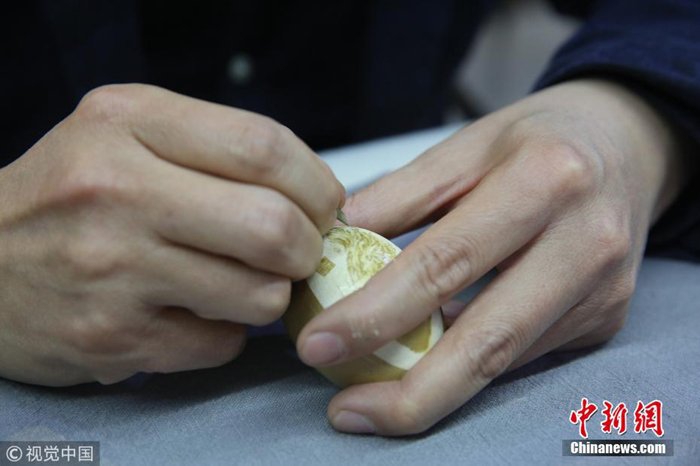 ວັນທີ 21 ມີນານີ້, ທ້າວ ຫວາງເສີງຊ້ຽວ ຢູ່ເມືອງທ້າຍຢວນແຂວງຊ່ານຊີ່ພວມແກະສະຫຼັກຮູບຢູ່ເທິງເປືອກໄຂ່ທີ່ໜາ 0,5 ມີລີແມັດຢູ່ໃນຫໍສິລະປະໂມ້ເສ້ຍ. ຕ້ອງໃຊ້ເວລາປະມານ 20 ມື້ຈຶ່ງຈະສາມາດສຳເລັດໃນການແກະສະຫຼັກຮູບຢູ່ເທິງໄຂ່ໜ່ວຍໜຶ່ງ, ແລະຕ້ອງໃຊ້ແຜ່ນມີດ 3-4 ແຜ່ນແກະສະຫຼັກເກືອບ 1 ໝື່ນເທື່ອ, ເຄີຍມີຄົນໃຊ້ເງິນ 1 ໝື່ນຢວນຊື້ເຄື່ອງແກະສະຫຼັກເຄື່ອງໜຶ່ງ.