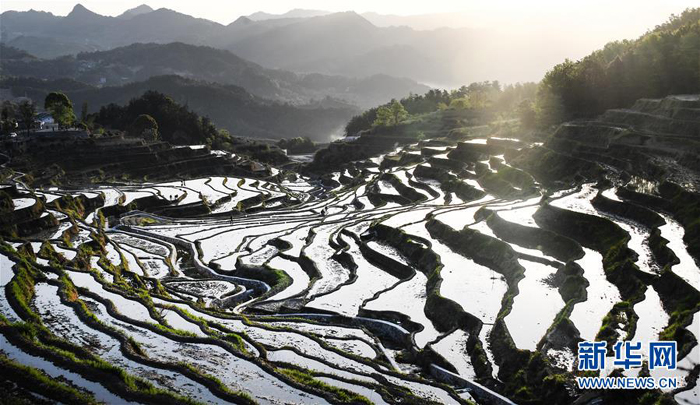 ພາບນີ້ຄືນັກທ່ອງທ່ຽວຫຼິ້ນຢູ່ນາຂັ້ນໄດຂອງບ້ານອູ້ຢູນຊ່ານເມືອງຊີຊູ່ນແຂວງຮູເປີຍ ສປ ຈີນທີ່ຖ່າຍໂດຍຍົນບໍ່ມີຄົນຂັບໃນວັນທີ 9 ເມສານີ້.